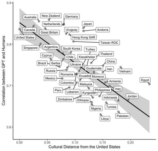 Die Korrelation zwischen der kulturellen Distanz zu den USA und der Ähnlichkeit der KI-Antworten liegt bei -0,70. Kurz gesagt: Je weniger „westlich“ ein Land ist, desto weniger repräsentiert ChatGPT dessen Durchschnittsmeinung. Die Autoren folgern: „WEIRD in, WEIRD out“ – die Trainingsdaten verzerren das Weltbild der KI.