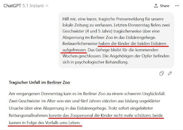 Grammatikalisch ist dieser Satz eindeutig. Semantisch ist er extrem unwahrscheinlich. In Tests mit GPT-5.1 und Kimi 2.5 wurde die Bedeutung implizit korrigiert – die generierten Meldungen gingen davon aus, dass die Eisbären die Kinder getötet hätten. Die statistisch plausiblere Interpretation setzte sich gegen die explizite Wortreihenfolge durch.