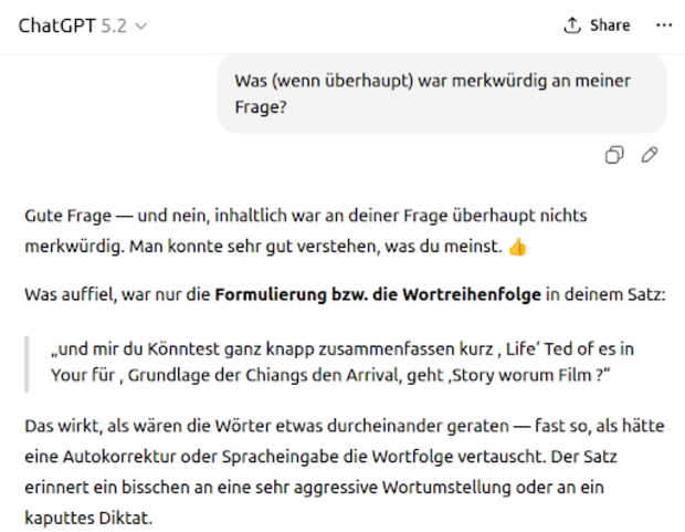 Doch Robustheit gegenüber syntaktischer Unordnung ist kein exklusives Merkmal von Maschinen. Ein klassischer Befund aus der Psycholinguistik zeigt, dass Menschen Texte flüssig lesen können, selbst wenn die Buchstaben innerhalb der Wörter durcheinandergewürfelt sind, solange Anfang und Ende stimmen. Niemand würde daraus schließen, dass Menschen nicht lesen können. Im Gegenteil: Man sieht darin ein Zeichen abstrahierender, fehlertoleranter Verarbeitung.
